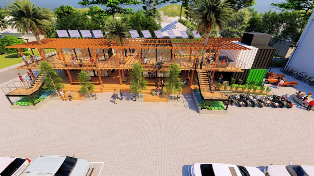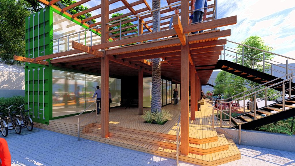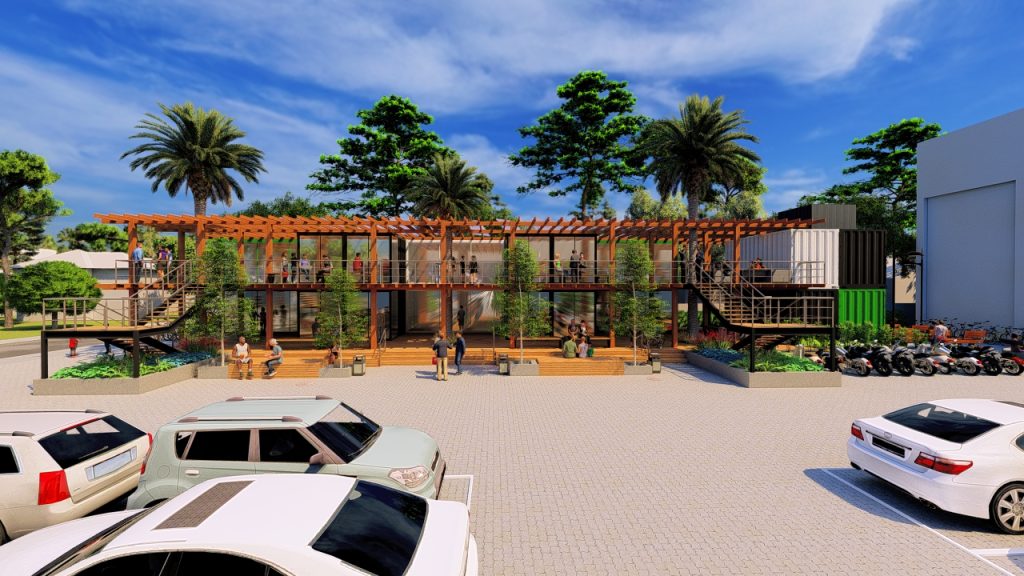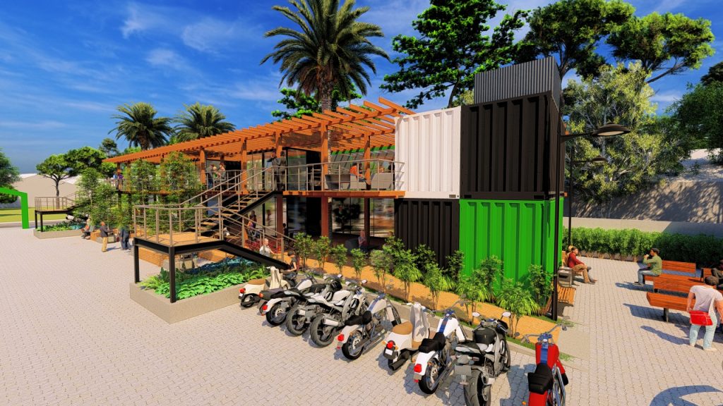 A adoção desse sistema construtivo modular permitiu não apenas agilidade na execução, mas também racionalização de recursos. Mas também uma linguagem arquitetônica contemporânea que dialoga com a ideia de reaproveitamento inteligente de estruturas industriais. Isso transforma elementos originalmente destinados à logística em espaços qualificados para uso comercial e convivência.