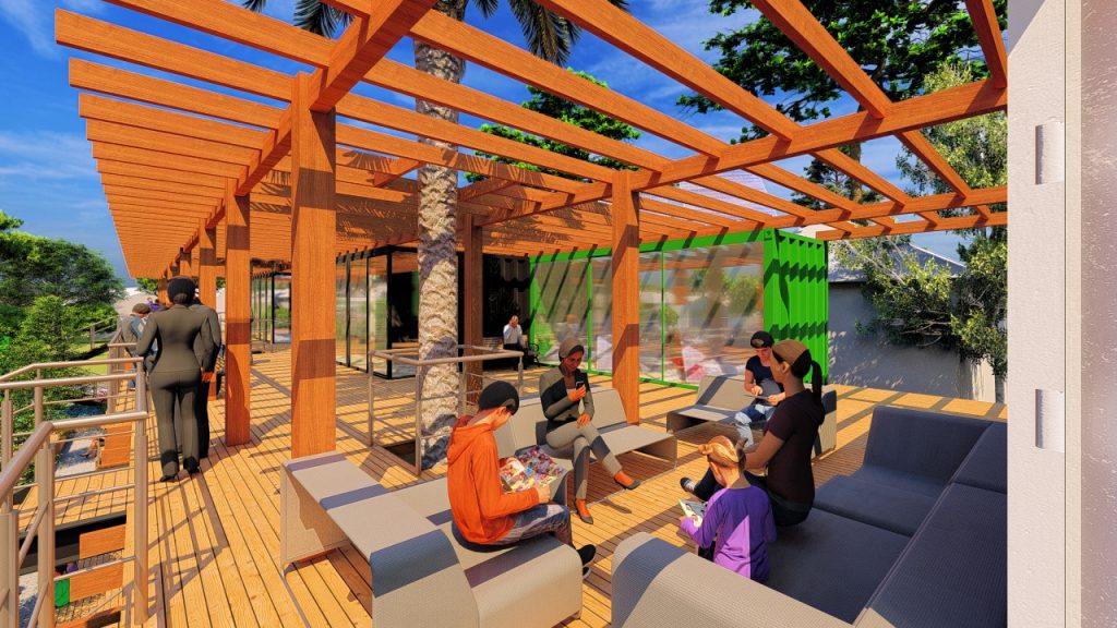 A materialidade do conjunto foi pensada para reforçar essa identidade contemporânea e acolhedora. A combinação entre estrutura metálica aparente, contêineres adaptados, decks em madeira e pergolados de sombreamento cria uma atmosfera arquitetônica que equilibra robustez e leveza visual.
